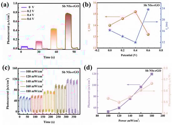 The photoelectrochemical (PEC) performance of the Sb NSs-rGO hybrid was carried out to investigate its photo behaviors. In Figure 3a, the linear sweep voltammetry (LSV) profiles from −0.6 V to 0.6 V for Sb NSs along with the Sb NSs-rGO hybrid are presented. As illustrated in the figure, both the Sb NSs and Sb NSs-rGO hybrids exhibit a positive response behavior upon illumination. The Sb NSs-rGO exhibit a remarkably greater photocurrent enhancement compared to the sole Sb NSs. It is proposed that intermingling rGO enhances the light-responsive properties of Sb NSs. Meanwhile, rGO indicate a poor spectral absorption, as well as Sb NSs increases the intensity of spectral absorption as shown in Figure S1a,b, which indicates the as-prepared Sb NSs-rGO hybrid exhibits an improved absorptive capacity, resulting in numerous electron–hole pairs. Subsequently, the amperometric curve (I-t) test was executed to examine the photo-response performance of both the Sb NSs and the Sb NSs-rGO hybrid. As shown in Figure 3b, the Sb NSs-rGO hybrid demonstrates superior photoresponse properties, with a remarkable enhancement in photoresponse (doubled) compared to Sb NSs under zero bias, which reveals the self-powered photoresponse feature. Moreover, under a 0.2 bias, the photoresponse performance of the Sb NSs-rGO hybrid is approximately 1.8 times that of pure Sb NSs. Notably, rGO exhibit slight photoresponse of 2.34 nA/cm2, as shown in Figure S2a, which is due to the restored sp2 carbon domains and structural defects facilitate the generation and separation of electron–hole pairs upon light absorption. At the same time, we measured the EIS curves of rGO and the prepared Sb NSs-rGO hybrid under both dark and light conditions, as shown in Figure S2b. It can be seen that rGO, as an excellent medium for charge transport, exhibits a relatively low contact resistance of around 10.4 Ω. However, the Sb NSs-rGO hybrid has a slightly higher contact resistance of around 13.7 Ω. Nevertheless, due to the excellent optical properties of Sb NSs, there are significant resistance fluctuations under both dark and light conditions, indicating that the multi-prepared Sb NSs-rGO hybrid has an improved light response behavior. To investigate their photoresponse behavior under self-powered conditions, I-t tests, as depicted in Figure 3c,d, were carried out to evaluate the photocurrent values and photoresponsivity. The measured photocurrent densities for Sb NSs and the Sb NSs-rGO hybrid photodetectors are 24.386 nA/cm2 and 48.830 nA/cm2, respectively. Remarkably, the photogenerated current density of the Sb NSs-rGO hybrid photodetector is roughly double that of the standalone Sb NSs photodetector. Furthermore, the photodetector response time is established using a criterion where it is determined at the juncture when 10% of the photocurrent is noted and when 90% of the photocurrent has returned, as described by the given equation [].