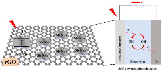 The self-powered mechanism of the prepared Sb NSs-rGO hybrid PEC-type photodetector as shown in Figure 6. When incident light irradiates, the photogenerated electrons transition from the valence band of Sb NSs to the conduction band, while rGO provides a high-conductivity pathway for electron transport, while the heterojunction interface promotes the separation of photogenerated carriers. The built-in electric field-driven by the generated bias potential results from the semiconductor potential barrier difference between sbNSs-rGO and the electrolyte. This spatial separation of charge carriers effectively suppresses the recombination of electron–hole pairs. Similar to the operation mechanism in a Schottky-type photodetector, this electrochemical reaction process spontaneously generates free electrons and establishes a stable photocurrent loop. The efficient charge separation and rapid carrier transport within the heterojunction contribute to the enhanced photoresponse performance, including improved responsivity and faster response dynamics.