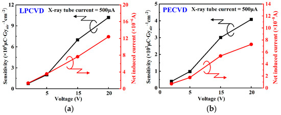 The variation in net induced current and sensitivity at different bias voltages of 2 V, 5 V, 15 V, and 20 V at a fixed X-ray tube current of 500μA: (a) LPCVD, (b) PECVD.
