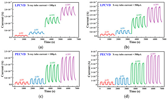 Transient response characteristics (I–t) of the X-ray detectors fabricated by (a,b) LPCVD and (c,d) PECVD at bias voltages of 2, 5, 15, and 20 V. X-ray tube currents are 100 μA for (a,c) and 500 μA for (b,d). The different colored lines in each figure represent the response characteristics at 2 V, 5 V, 15 V, and 20 V bias, respectively.