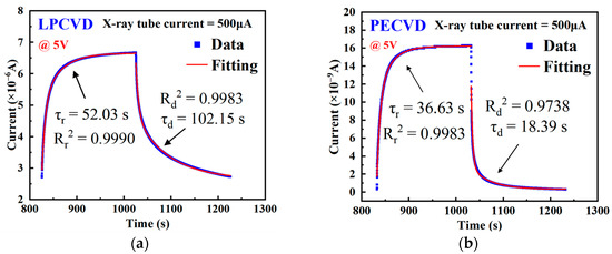The photocurrent response time dependency curves of β-Ga2O3 X-ray detectors fabricated by LPCVD and PECVD under an X-ray tube current of 500 μA and a 5 V bias are shown in Figure 8a,b, respectively. The response time (τr) and recovery time (τd) were calculated by double exponential fitting of the I–t characteristic curves [34]: