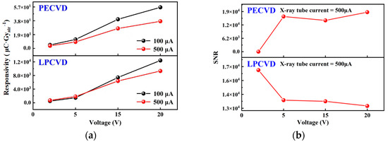(a) The responsivity of the detectors fabricated by LPCVD and PECVD varies with the bias voltage under X-ray irradiation at different tube currents. (b) The signal-to-noise ratio (SNR) of the detectors fabricated by LPCVD and PECVD varies with the bias voltage at an X-ray tube current of 500 μA.