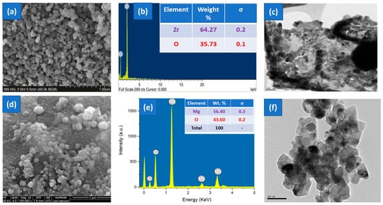 (a,d) SEM, (b,e) EDX, and (c,f) TEM images of ZrO2 and MgO NPs.