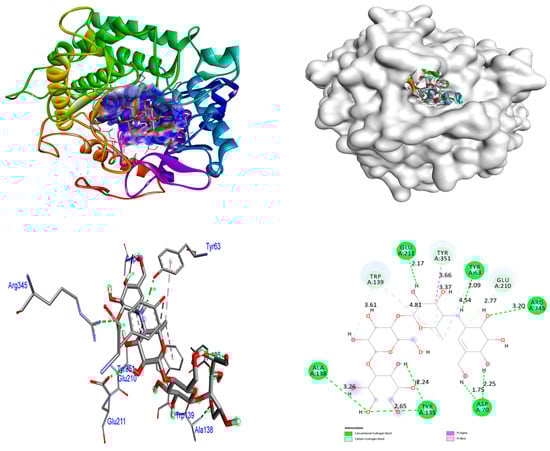 The docking investigations were carried out using the Autodock Vina tool [32]. In each instance of a biological assessment, the protein structure was first entered into Vina and then transformed into a macromolecule by converting it into a pdbqt for docking applications. The search grid for the glucoamylase protein (PDB ID: 2F6D) is centered at x-coordinate 10.945, y-coordinate 8.351, and z-coordinate −9.511. The grid consists of the parameters: size_x, y, z = 24, 24, 24. The grid maintains a uniform spacing of 1.0 Å between each point. The focal coordinates of the search grid for the α-amylase protein (PDB ID: 2QV4) are x: 10.721, y: 48.233, and z: 20.805. The grid dimensions were defined as x, y, z = 24, 24, 24, with a spacing of 1.0 Å. The human antioxidant enzyme search grid (PDB ID: 3MNG) is located at coordinates x: 8.341, y: 45.637, and z: 30.621. The grid dimensions are x, y, z = 18, 18, 18, and have a spacing of 1.0 Å. A positive integer value of 8 has been assigned to the exhaustiveness level. The other variables were set to their usual settings for Vina docking and were not specifically stated. The chemical with the smallest binding affinity score is considered to possess the highest activity. The docking results were visually evaluated using the Discovery Studio 2019 software.