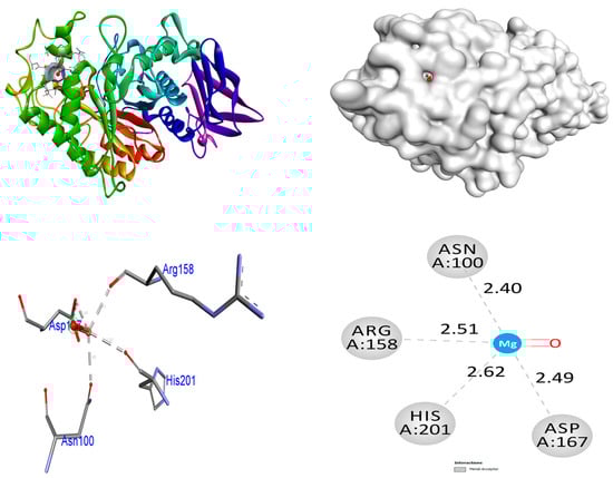 The present work utilized the crystalline arrangement of human pancreatic α-amylase, which was complexed with acarbose and nitrile (PDB ID: 2QV4), in order to conduct an α-amylase inhibition experiment on antidiabetic enzymes. The MgO NPs demonstrate superior binding affinities (−9.5 kcal/mol) in comparison to the control acarbose (binding affinity: −7.3 kcal/mol). MgO NPs do not form any hydrogen bonds with protein 2QV4. The amino acid residues Asn100, Arg158, Asp167, and His201 promoted metal–acceptor interactions. Among the 2QV4 proteins, ZrO2 NPs demonstrate superior binding affinities (−8.9 kcal/mol) in comparison to the control acarbose (binding affinity: −7.3 kcal/mol. ZrO2 NPs form two hydrogen bonds with protein 2QV4. The hydrogen bonding contact involving the amino acid residue Asn298 was found to have a bond length of 3.38 and 3.22 Å, respectively. The amino acid residue Arg195 promoted hydrophobic interactions. Six hydrogen bonds are fashioned amongst the control acarbose molecule and the target 2QV4. A hydrogen bonding interaction was involved among the amino acid residues Tyr62 (bond length: 2.91 Å), Tyr151 (bond length: 2.74 Å), Thr162 (bond length: 2.34 Å), and Glu233 (bond lengths: 3.02, 2.66, and 2.31 Å). The His201, Asp300, and His305 amino acid residues promoted hydrophobic relations. Hydrophobic and hydrogen bonding connections amongst amino acid residues in the 2QV4 protein and ZrO2 and MgO NPs and control acarbose are illustrated in Figure 8, Figure 9 and Figure 10. The findings are represented in Table 6.