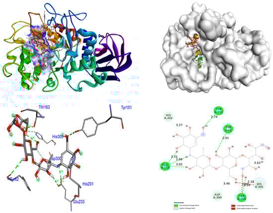 Interactions of control acarbose inside the binding cavity of 2F6D.