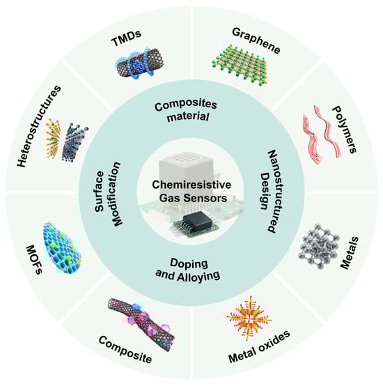 As displayed in Table 1, we summarize the effects of different modification methods on the selectivity and gas-sensing performance of chemiresistive gas sensors as reported in the literature.