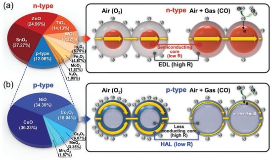 For n-type SMOs (e.g., ZnO, In2O3) [29,30], an electron depletion layer (EDL) forms due to surface oxygen adsorption and ionization, creating a “semiconductor core-high-resistance EDL shell” structure that requires overcoming a potential barrier for carrier transport. As shown in Figure 2a, when reducing gases such as CO contact the surface, they react with adsorbed oxygen, releasing electrons back into the EDL, which lowers its resistance and significantly decreases the sensor’s overall resistance [31]. For p-type semiconductor oxides (e.g., CuO and NiO) [32], surface oxygen adsorption captures electrons, leading to hole accumulation at the surface and forming a low-conductivity core with a hole accumulation layer (HAL) shell. This creates a dual-channel conduction system: a high-mobility HAL channel and a low-conductivity core channel. When reducing gases react, injected electrons recombine with HAL holes, reducing HAL conductivity and increasing the sensor’s overall resistance (Figure 2b) [31].