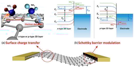 Schematic illustration of gas sensing mechanisms of sensors based on 2D layered nanomaterials (a) Surface charge transfer. (b) Schottky barrier modulation. Reproduced with permission from ref. [38]. Copyright 2018 Springer Nature.