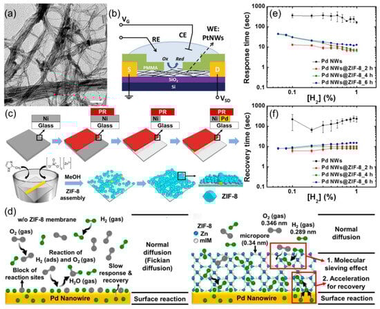 (a) TEM image of as-prepared ultrathin PtNWs with a diameter of ≈3 nm. (b) Schematic illustration of the electrochemical cleaning set up for the PtNW sensor device. Reproduced with permission from ref. [69]. Copyright 2016 John Wiley and Sons. (c) Schematic illustration of the synthesis of Pd NWs@ZIF-8 using the LPNE process and the following assembly process. (d) Schematics of the sensing model for Pd NWs without and with ZIF-8 membrane. The ZIF-8 (0.34 nm in size) membrane filters out O2 (0.346 nm), allowing only H2 (0.29 nm) to reach the Pd NWs. (e) Response times, and (f) recovery times of Pd NWs and Pd NWs/ZIF-8 sensors against H2 concentrations in air. Various thicknesses of ZIF-8 onto Pd NWs were achieved by varying the assembly time at 2, 4, and 6 h. Reproduced with permission from ref. [70]. Copyright 2017 American Chemical Society.