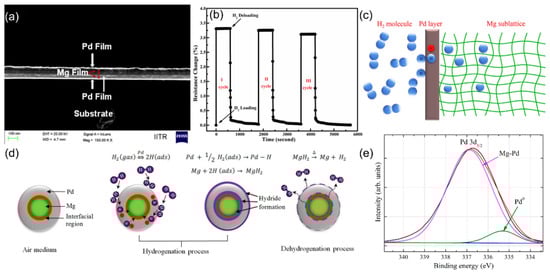 (a) FE-SEM cross-section images of as-deposited of Pd/Mg/Pd/Mg/Pd multilayers. (b) Pd/Mg thin films, during hydrogenation (2 bar H2) and dehydrogenation at different temperatures. (c) Schematic diagram of reaction mechanism between hydrogen and Pd/Mg lattice. Reproduced with permission from ref. [71]. Copyright 2015 Elsevier. (d) Schematic of the hydrogen sensing mechanism for Pd-capped Mg bimetallic NPs. (e) XPS spectra of Pd5/2 electrons. Reproduced with permission from ref. [72]. Copyright 2017 Elsevier.