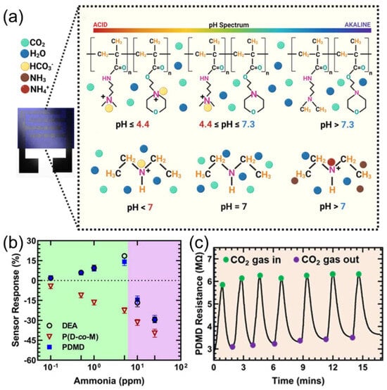 (a) P (D-co-M) protonation with carbonic acid ion over a wide pH range (4.4–7.3) and DEA protonation in the presence of carbonic acid ion and ammonium ion. (b) PDMD, DEA, and P (D-co-M) solid-state sensor response to NH3 gas (0.1–25 ppm). (c) PDMD sensor recovery and reversibility in the presence and absence of humidified CO2 gas. Reproduced with permission from ref. [79]. Copyright 2024 American Chemical Society.
