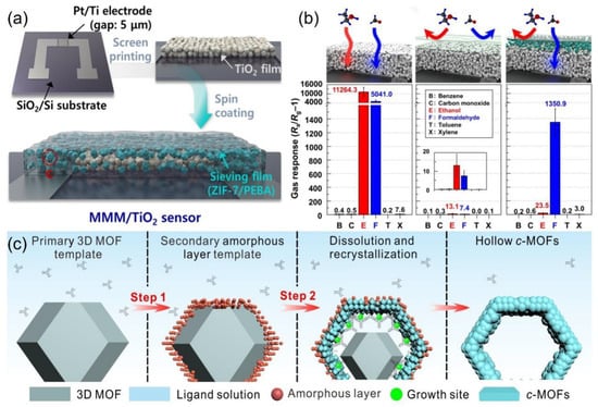 (a) Schematic illustration of steps for the fabrication of MMM coated TiO2 sensors. (b) Gas responses of a bare TiO2, Pure PEBA/TiO2, and 5MMM/TiO2 sensors exposed to 5 ppm gas at 23 °C under UV illumination (wavelength: 365 nm). Reproduced with permission from ref. [83]. Copyright 2021 Springer Nature. (c) Schematic overview of the two-stepped transformation mechanism of ZIF-8 NPs to hollow Zn-HHTP NPs. Reproduced with permission from ref. [84]. Copyright 2023 John Wiley and Sons.