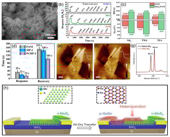 (a) SEM images of Pt/MoS2/PANI (6%, Pt/MP-2). (b) Gas-sensing responses of PANI, MP-2, and Pt/MP-2 flexible gas sensors to the concentration of 50 ppm of various gases at RT. (c) Adsorption energy values (Ea) and Bader’s charge (ΔQ) of PANI and MoS2 (002)/PANI to NH3, TMA, and TEM gases. (d) Average response and recovery times of PANI, MP-2, and Pt/MP-2 flexible gas sensors to 50 ppm NH3 vapor at RT. Reproduced with permission from ref. [90]. Copyright 2023 American Chemical Society. KPFM images of the heterojunction (e) before and (f) after exposing to NO2. (g) Raman spectra of the heterojunction before and after NO2 exposure at room temperature. (h) Schematic diagram of the fabrication of the MoS2/GaSe heterojunction. Reproduced with permission from ref. [92]. Copyright 2021 John Wiley and Sons.