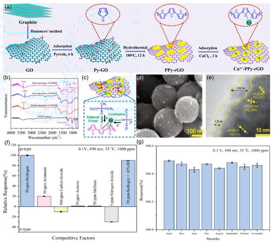 (a) Schematic illustration of the fabrication process of Cux+-PPy-rGO hybrids. (b) FT-IR spectra of Cux+-PPy-rGO sample before and after adsorbing DMMP. (c) Schematic illustration of the DMMP sensing mechanism on Cux+-PPy-rGO hybrids. Reproduced with permission from ref. [98]. Copyright 2023 Elsevier. (d) SEM images of rGPT. (e) HR-TEM images for rGO encapsulated shell and crystalline planes of TiO2-NSand Pd-QDs. (f) Selectivity and (g) long term stability of the fabricated rGPT-NS at 35 °C under 0.1 V and 490 nm wavelength. Reproduced with permission from ref. [99]. Copyright 2023 Elsevier.