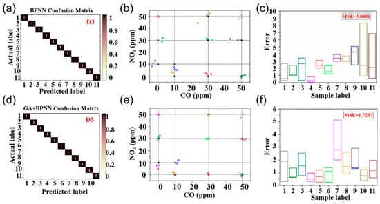 (a–c) Corresponds to the normalized confusion matrix, correlation performance, and predicted concentration box diagram of BPNN detection of CO and NO2. (d–f) Corresponds to the normalized confusion matrix of GA plus BPNN for detecting CO and NO2, the correlation performance, and the predicted concentration box diagram. Reproduced with permission from ref. [125]. Copyright 2021 Elsevier.