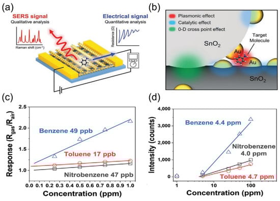 - Han, H.J.; Cho, S.H.; Han, S.; Jang, J.-S.; Lee, G.R.; Cho, E.N.; Kim, S.-J.; Kim, I.-D.; Jang, M.S.; Tuller, H.L.; et al. Synergistic Integration of Chemo-Resistive and SERS Sensing for Label-Free Multiplex Gas Detection. Adv. Mater. 2021, 33, 2105199. [Google Scholar] [CrossRef] [PubMed]
