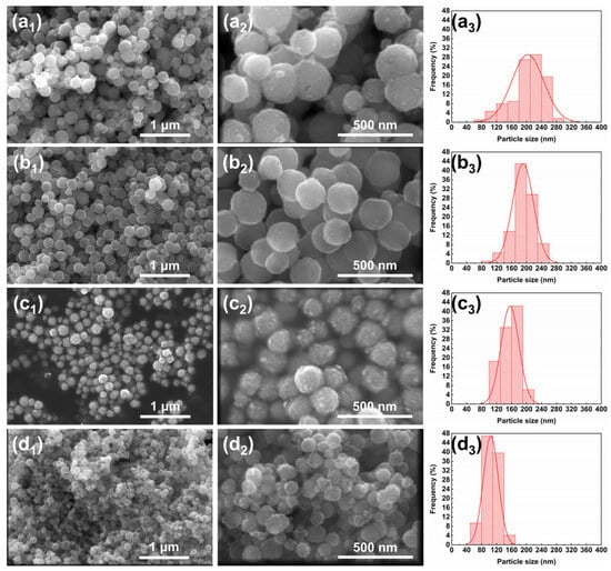 The SEM images and particle size distribution diagrams of the samples are shown in Figure 3a1–a3, depicting the solvent system with 50% diethylene glycol (DEG), where the average particle size of MnFe2O4 nanoparticles is 203.43 ± 43.05 nm. Compared to the ethylene glycol system, the particle size significantly decreases, approaching the target size of 200 nm. However, the relative standard deviation (RSD) increases slightly to 21.16%. When the DEG proportion further increases to 60% [Figure 3b1–b3], the average particle size of MnFe2O4 is 190.69 ± 28.18 nm with an RSD of 14.78%, representing the smallest RSD among the designed proportional conditions. This sample shows the narrowest particle size distribution and the most uniform particle growth. In Figure 3c1–c3, with a DEG proportion of 70%, the average particle size is 155.99 ± 24.06 nm, showing a substantial decrease from the previous sample, while the RSD remains relatively stable at 15.42%. For Figure 3d1–d3 with 80% DEG, the average particle size of MnFe2O4 is 104.69 ± 20.19 nm, and the RSD increases to 19.29%, accompanied by a broadened particle size distribution and slight aggregation between particles.