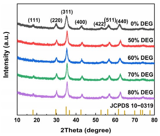 The crystal structure of the MnFe2O4 nanoparticles was determined by XRD, and the corresponding XRD patterns are shown in Figure 4. Characteristic diffraction peaks were observed at 2θ = 18.18°, 29.90°, 35.20°, 42.71°, 53.05°, 57.08°, and 62.20°, corresponding to the (111), (220), (311), (400), (422), (511), and (440) crystal planes of the MnFe2O4 spinel structure (JCPDS 10-1039), indicating successful synthesis of MnFe2O4 nanoparticles via the solvothermal method. The XRD patterns of samples synthesized with varying diethylene glycol ratios in the solvent system were all in good agreement with the standard card, confirming that the nanoparticles synthesized with different solvent systems remained as MnFe2O4.
