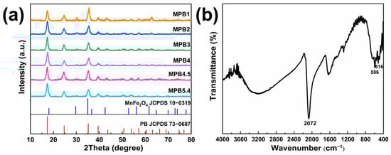 (a) XRD pattern, MPB1, MPB2, MPB3, MPB4, MPB4.5, and MPB5.4 represent different MnFe2O4:PB molar ratios (5:1, 5:2, 5:3, 5:4, 5:4.5, 5:5.4), respectively; (b) infrared spectrum of MnFe2O4@PB nanocomposite.
