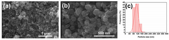 (a) SEM image at 100,000× magnification, scale bar = 1 μm; (b) SEM image at 300,000× magnification, scale bar = 500 nm; (c) particle size distribution diagram of MnFe2O4@PB nanocomposite.