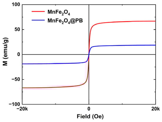 To verify the magnetic properties of the synthesized samples and their potential for future magnetic targeting applications, their magnetic properties were measured using a vibrating sample magnetometer (VSM), and the resulting hysteresis loops are presented in Figure 7. Both MnFe2O4 and MnFe2O4@PB exhibit small coercivity and remanence, indicating that both possess excellent superparamagnetic properties []. The saturation magnetization (Ms) of MnFe2O4 is 66.53 emu/g, while that of MnFe2O4@PB is 18.74 emu/g. Specifically, the saturation magnetization (Ms) of MnFe2O4 in this study is essentially consistent with the upper limit of the 45–67 emu/g range for samples prepared by the chemical oxidation method [], and it is also significantly higher than the 29.3 emu/g of the samples reported by Li et al. []. After modification with Prussian blue, MnFe2O4 still retains considerable magnetic ability, with its saturation magnetization (Ms) being higher than that of the multifunctional nanoparticles (MFNPs) containing Fe3O4 and PB components reported by Du et al. (approximately 8 emu/g) []. Notably, Du’s study has confirmed that their prepared MFNPs, under the guidance of an external magnetic field, can achieve a tumor accumulation level twice as high as that in the group without a magnetic field, and the photothermal therapeutic efficacy can be enhanced through magnetic targeting. Therefore, the MnFe2O4@PB nanocomposites in this study, which possess a higher saturation magnetization (18.74 emu/g), are expected to exhibit stronger magnetic response ability. This magnetic response characteristic enables it to achieve directional movement and enrichment under the guidance of an external magnetic field, demonstrating good magnetic targeting potential and providing an important basis for further exploration of its combined application with photothermal performance in future research.