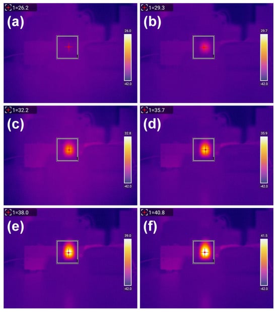 The photothermal heating experiments under laser irradiation were repeated three times for samples with different modification ratios in each group. The heating data are shown in Figure 9; this displays the infrared thermal images of the MPB1 sample under laser irradiation at different times: (a) 0 min, (b) 1 min, (c) 2 min, (d) 3 min, (e) 4 min, and (f) 5 min. The conditions applied were as follows: particle concentration: 2 g/L; number of repetitions: 3 times; laser wavelength: 808 nm; laser power density: 3.41 W/cm2.