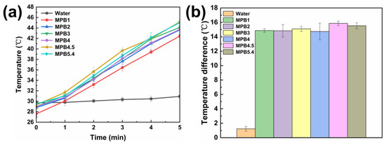 Figure 10b presents a data plot of the temperature differences between the 5th minute of heating and the initial temperature before light irradiation for each group of samples. This plot clearly illustrates the comparison of the 5 min photothermal heating effects among six groups of samples with different molar modification ratios and the control group. Among these samples, MPB4.5 exhibits the greatest temperature increase, indicating that the sample under the condition of MPB4.5 has stronger heating capacity upon near-infrared laser irradiation and a better photothermal effect.
