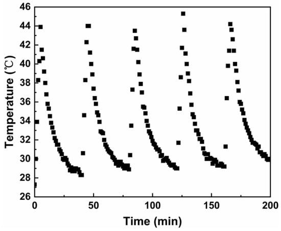 Sample MPB4.5 was prepared as a 2 g/L test solution for the examination of photothermal stability, as shown in Figure 11. After undergoing five cycles of stability testing, the solution was still able to reach the maximum temperature (43.9 °C) achieved during the first 5 min of light irradiation, demonstrating that this sample exhibits excellent photothermal stability.