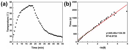 (a) Time–temperature relationship of sample MPB4.5 cooling to room temperature after laser irradiation ceases to increase the temperature; (b) linear relationship between the negative natural logarithm of the cooling driving force −ln(θ) and time, y = 445.48 x + 124.39, R2 = 0.9735.