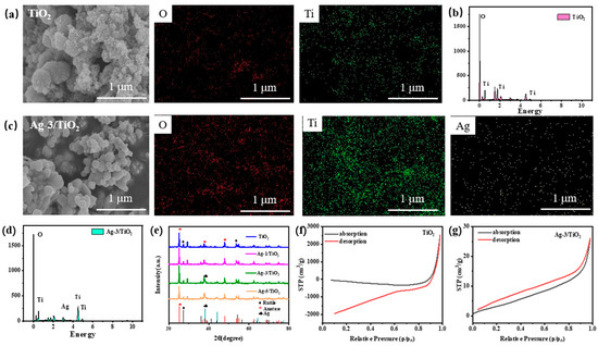 In order to observe the surface morphology of the materials, we performed SEM tests on TiO2 decorated with different concentrations of Ag+ (Figure 1a,c). As can be seen from the figures, pure TiO2 has obvious agglomeration phenomenon and the grains are piled up together. And with the increase of the concentration of Ag+, the aggregation phenomenon of TiO2 was obviously reduced, indicating that the doping of Ag+ could effectively improve the agglomeration phenomenon of TiO2, increase the specific surface area of the composite material, and thereby contribute to enhancing the photocatalytic activity [2,17,18,22]. We believe that by decorating TiO2 with Ag, the Ag/TiO2 composite material already contains Ag elements. Therefore, to verify our conjecture, we conducted an EDS test on the Ag/TiO2 composite material. From the figure (Figure 1a–d), it can be clearly seen that the material contains three elements: O, Ti and Ag, and no other elements, indicating that silver-decorated TiO2 has been successfully prepared. Furthermore, TEM and XPS data also confirm the successful modification of TiO2 with Ag as shown in Figures S1 and S2.