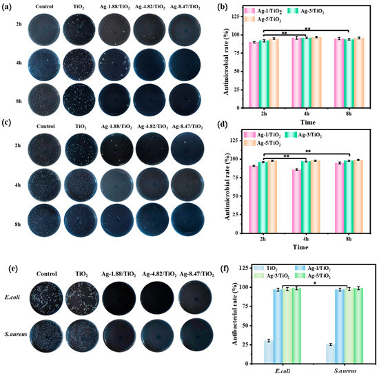 (a) Plate count graphs of E. coli and (c) S. aureus under dark conditions, (b,d) the corresponding statistical graphs of antibacterial rates of Ag/TiO2 composite materials, (e) plate count graphs of E. coli and S. aureus under light conditions, (f) the corresponding statistical graphs of antibacterial rates of Ag/TiO2 composite materials. All statistical data are represented as mean ± SD; n = 3. The significance of differences was treated as follows: * represents p < 0.05, ** represents p < 0.01.