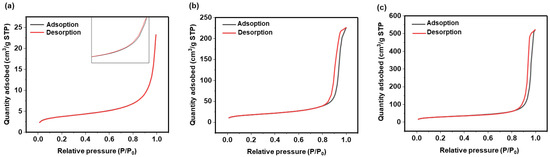 The nanoparticles exhibit a non-porous structure as confirmed through nitrogen adsorption analysis (Figure 3) exhibiting isotherms of Type II for the three sizes of SiO2 nanoparticles. According to the literature, Type II isotherm suggests that the silica oxide nanoparticles are either non-porous or possesses interparticle porosity (pores with diameters > 50 nm). This is further confirmed by the hysteresis loop, which is not well-pronounced and exhibits an H3-type configuration. This is a characteristic more commonly associated with this type of isotherm [37]. The initial concave region reflects the formation of a monolayer, while the steep rise at higher pressures indicates unrestricted multilayer adsorption [38]. The obtained specific surface areas, SBET, are equal to 13, 64 for and 107 m2 g−1 for, respectively, the SiO2 nanoparticles of 209, 53, and 37 nm. These results are consistent with dense silica nanoparticles exhibiting a surface area associated with interparticle porosity.