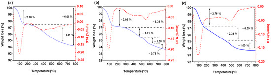 The thermogravimetric analysis (TG) curves (blue) reveal a multi-step mass loss process, while the derivative thermogravimetric (DTG) curves (red) highlight the decomposition stages at corresponding temperature ranges (Figure 4). The initial weight loss observed for all samples below 150 °C can be attributed to the removal of physically adsorbed water molecules and residual ammonia, as described by Jafarzadeh et al. [39]. Between 150 and 300 °C, the weight loss corresponds to the loss of trapped water, ammonia, and ethanol molecules. Between 300 and 800 °C, the weight loss is primarily due to the dehydroxylation of residual Si–OH groups and the degradation of the remaining SiOEt species. However, FTIR analysis (Figure 2) confirms the absence of characteristic C–H bands, indicating that the organic groups are absent and that the observed weight loss is mainly associated with the dehydroxylation of the Si–OH species. This overall weight loss is comparable across the three samples, with values of 3.31, 3.47, and 3.34%, respectively, for nanoparticles of 209 nm, 53 nm, and 37 nm. Note that the weight loss begins earlier for the smallest nanoparticles’ sample.