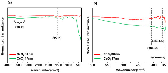 (a) FTIR spectra of Cerium oxide nanoparticles; (b) Magnification of the spectra in the 600–350 cm−1 window.