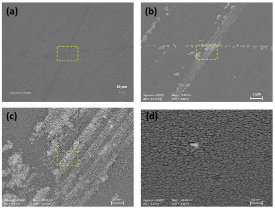 HRSEM images of the initial pre-polished Zerodur® mirror surface with different magnifications showing prominent micro-scratches focused on the selected scratch region (in yellow) and revealing the microstructural texture and damage morphology or residual polishing grain. Scale bars = 10 μm (a), 2 μm (b), 200 nm (c), and 100 nm (d). Each subsequent image is a magnified view of the previous one, with the magnified area indicated by a yellow dashed rectangle.