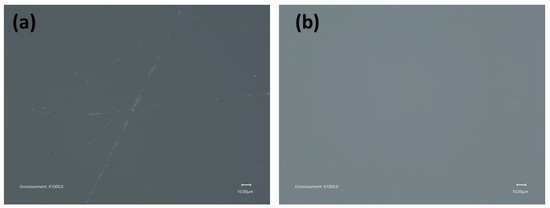 HRSEM images of the Zerodur® mirror surface at 1000× magnification: (a) initial surface showing prominent micro-scratches prior to polishing; and (b) same area after 1 h of polishing with 209 nm SiO2. Scale bars = 10 μm.