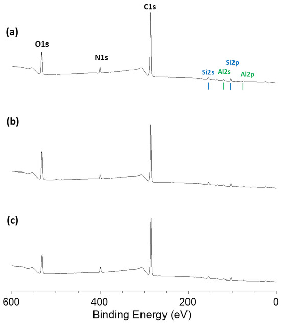 XPS surveyspectra of Zerodur® surface after 1 h hyperpolishing with slurries containing SiO2 nanoparticle of the following: (a) 37 nm, (b) 53 nm, and (c) 209 nm.