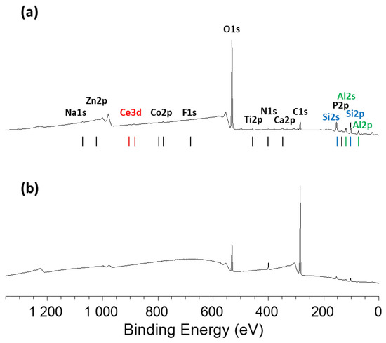 XPS survey spectrum of Zerodur® surface after 1 h hyperpolishing with two slurries containing CeO2 nanoparticles of the following: (a) 17 nm and (b) 30 nm.