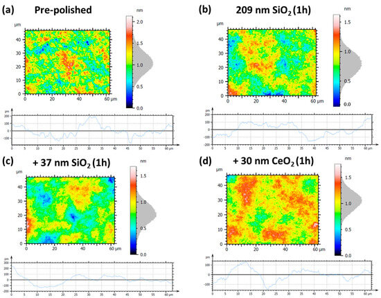 Note that similar surface roughness values (Sa ≈ 0.15 nm) after one hour of treatment were obtained with CeO2 and SiO2 nanoparticles of equivalent size (~30 nm) under identical CMP conditions even though the initial surface quality was not the same. However, a distinction emerges in surface quality when assessed using profile-based roughness metrics, reflecting variations in the effectiveness of the polishing process in reducing peak height and surface irregularities between SiO2 and CeO2 nanoparticles. Specifically, CeO2 nanoparticles yield significantly lower arithmetic roughness values, with Pa = 35.6 pm and Pq = 41.9 pm, compared to Pa = 56.1 pm and Pq = 71.2 pm for SiO2 abrasives. These results highlight the polishing capability of CeO2 at the nanoscale, likely attributable to its combined mechanical and chemical interaction with the Zerodur®, which is conducive to uniform material removal and smooth final surface morphology. This effect has also been reported in studies realized using ceria nanoparticles on other substrates [24,62].