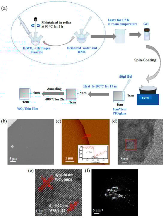 1.0 g of H2WO4 was mixed with 20 mL of 30% H2O2 and refluxed at 90 °C for 3 h to produce a solution of clarified yellow tungsten peroxo complex. After dilution to 0.3 M, nitric acid was added dropwise to adjust the pH to 2–3 and filtered. The FTO substrate was cleaned sequentially by acetone, isopropanol, deionised water by ultrasonication, and blown dry by nitrogen. 50 μL of the solution was spin-coated onto the substrate: the first section was spread evenly at 1500 rpm/10 s, and the second section was densified at 3500 rpm/30–60 s [26]. The membrane was heated at 100 °C for 15 min. The wet film was heated at 100 °C for 15 min to remove residual solvents and peroxides, followed by vacuum-programmed heating to 400 °C for 2 h. Finally, WO3 semiconducting thin films with a thickness of 3 nm were fabricated. The synthesis flow is shown in Figure 1a.