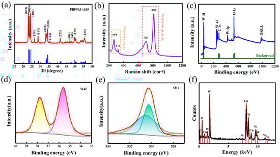 (a) XRD image of tungsten trioxide. (b) Raman spectral image of tungsten trioxide. (c) XPS full-spectrum image of WO3 nanofilm. (d) W4f spectral image of WO3 nanofilm. (e) O1s spectral image of WO3 nanofilm. (f) EDS images of WO3 nanofilm.