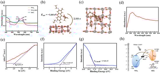 Figure 4d,e show the plots of the UV-vis spectra and (αhν)1/2 against hν, respectively. According to the research of J. Tauc et al., [33], the band gap of the WO3 nanomaterials is about 2.53 eV. From the UPS spectra of WO3 nanofilm (Figure 4f,g), information about the bandgap of the current substrate is obtained, including the valence band (VB) and the conduction band (CB) of WO3. Based on Formulas (2)–(4), we derive the ultraviolet photoelectron spectroscopy (UPS) of WO3 with a figure of merit of 4.17 eV, with the VB located at 7.3 eV and the CB at 4.77 eV.