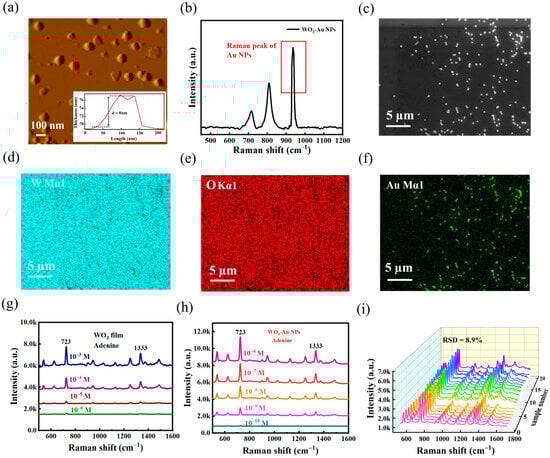 (a) AFM image of WO3-Au NPs. (b) Raman spectrum of WO3-Au NPs; (c) SEM image of WO3-Au NPs. (d) EDS Mapping image of W element. (e) EDS Mapping image of O element, and (f) EDS Mapping image of Au element. (g) Comparison of the detection of adenine molecules at different concentrations by WO3 nanofilm. (h) Comparison of the detection of adenine molecules at different concentrations by WO3-Au NPs. (i) Raman spectra of SERS of adenine (10−9 M) were collected at 20 random sites on WO3-Au NPs.
