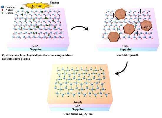 - Ngo, T.S.; Le, D.D.; Tran, D.K.; Song, J.H.; Hong, S.K. In Situ Oxidation of GaN Layer and Its Effect on Structural Properties of Ga2O3 Films Grown by Plasma-Assisted Molecular Beam Epitaxy. J. Electron Mater. 2017, 46, 3499–3506. [Google Scholar] [CrossRef]