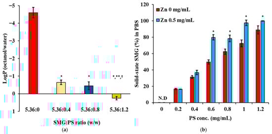 Changes in lipophilicity and solubility of SMG in aqueous media following complexation with PS in the absence and/or presence of Zn. (a) LogP (octanol/distilled water) values of SMG–PS complexes at varying SMG:PS ratios (5.36:0–5.36:1.2 mg/mL) in the presence of Zn (0.5 mg/mL), measured at 25 °C (b) Percentage of SMG remaining in solid-state form following the addition of complexes into phosphate-buffered saline (PBS), as a function of PS concentration (0–1.2 mg/mL) and Zn ion content (0 or 0.5 mg/mL) with 5.36 mg/mL of SMG, measured at 25 °C. Notes: Data represents mean ± SD (n = 3). N.D. means ‘not detected’. In panel (a), significant differences compared with 5.36:0 (* p < 0.05), 5.36:0.4 (** p < 0.05), and 5.36:0.8 († p < 0.05), respectively. In panel (b), significant difference compared with Zn 0 mg/mL (* p < 0.05).