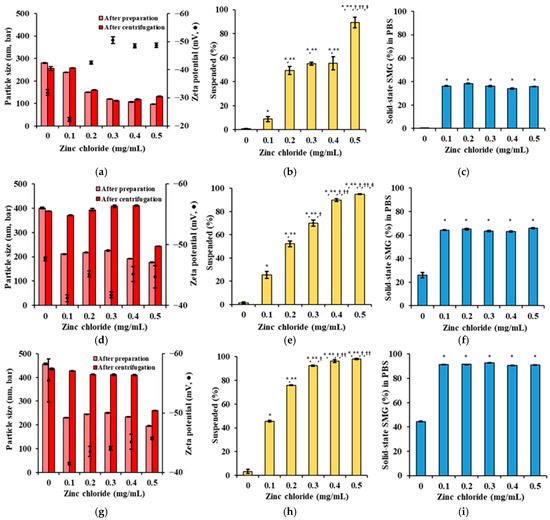 The ratio of SMG, PS, and Zn was further fine-tuned with respect to particle size, solid-state SMG (%) in the formulation, and upon dilution in PBS [46]. The concentrations of SMG, Kolliphor ELP, and Na.CMC were fixed at 5 mg/mL, 2 mg/mL, and 2.5 mg/mL, respectively, while PS (0.4, 0.8, 1.2 mg/mL) and Zn (0–0.5 mg/mL) concentrations were varied. The results demonstrated that increasing PS and Zn concentrations significantly influenced the physical properties and suspension stability of the SMG–PS–Zn nanocomplex (Figure 4). At the lowest PS concentration (0.4 mg/mL), particle sizes were initially small but increased after centrifugation, indicating poor mechanical stability and a tendency toward aggregation under stress. As Zn concentration increased, the proportion of dissolved SMG decreased while the suspended fraction rose; however, a substantial portion remained dissolved, PBS precipitation remained between 40–50% (Figure 4a–c).