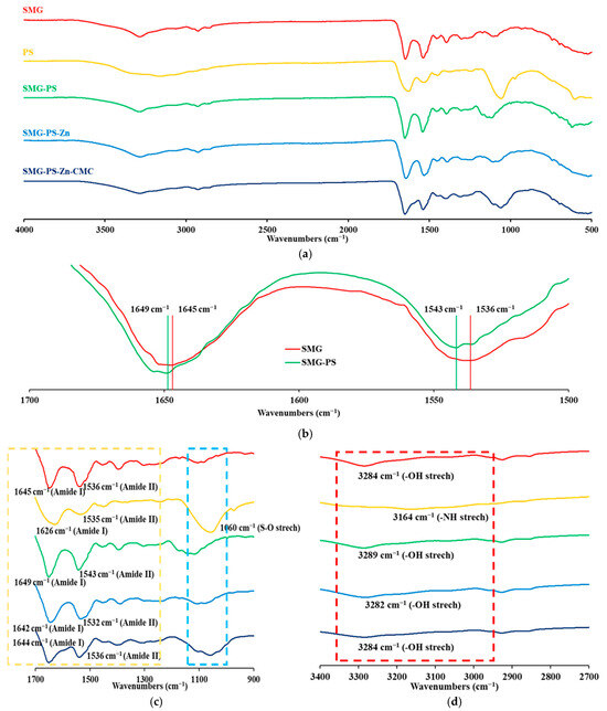 FT-IR spectra of SMG, PS, and their electrostatic complexes prepared at various weight ratios: SMG–PS (5.36:1.2), SMG–PS–Zn (5.36:1.2:0.5), and SMG–PS–Zn–CMC (5.36:1.2:0.5:2.5). (a) Full spectral range from 500 to 4000 cm−1. (b) Expanded region highlighting the shifts in the Amide I and II bands. (c) Fingerprint region showing amide I and amide II bands, along with additional characteristic peaks indicating newly formed bonding interactions. (d) Expanded region highlighting hydroxyl (O–H) and protonated amine (NH3+) stretching vibrations. Note: Dashed boxes mark key absorption bands of interest. Remarkable wavenumbers were denoted in the FT-IR spectrum.