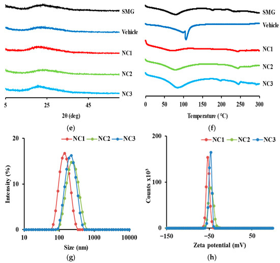 Representative SEM images of SMG raw material and SMG–PS–Zn nanocomplexes. (a) SMG raw material; (b) SMG–PS–Zn nanocomplex prepared at a 5.36:0.4:0.5 ratio (NC1); (c) nanocomplex at a 5.36:0.8:0.5 ratio (NC2); and (d) nanocomplex at a 5.36:1.2:0.5 ratio (NC3). Physical characteristics of SMG-PS-Zn nanocomplexes. (e) XRD patterns and (f) DSC curves of SMG raw material, blank vehicle, and nanocomplexes respectively. (g) Particle size distributions and (h) zeta potential profiles of the nanocomplexes (NC1, NC2, and NC3).