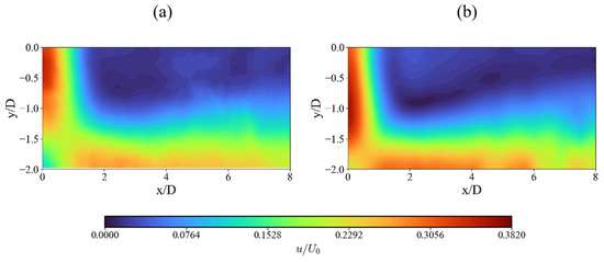 Comparison of non-dimensional averaged velocity contours: (a) SS and (b) SHS.